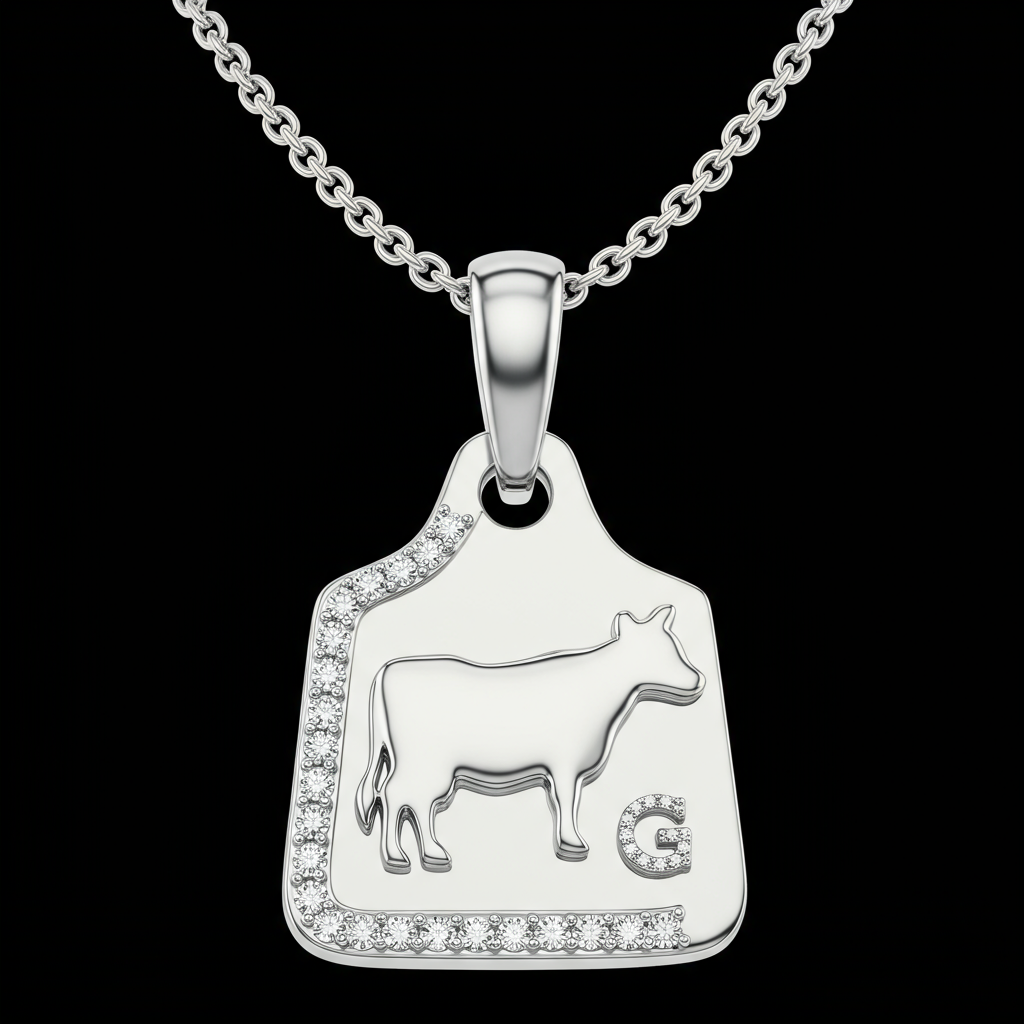 The Cow Tag Necklace offers a luxurious and modern interpretation of an industrial silhouette, featuring a polished 18KT white gold pendant ideal for personalized engraving. This unique shape is elegantly bordered by a precise line of brilliant-cut VVS diamonds, catching the light with remarkable brilliance. Suspended from a delicate yet sturdy adjustable chain, this piece makes a sophisticated statement of individuality and high craftsmanship. It is the perfect heirloom quality piece designed for versatile daily wear.