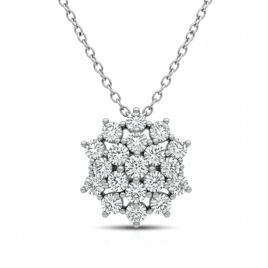 The Pandora Necklace is a masterful expression of light and structure, featuring a captivating cluster design centered around a brilliant array of fine diamonds. Crafted in lustrous 18KT white gold, this piece offers an enduring sparkle that commands attention without overpowering elegance. The meticulously set diamonds create a dynamic, shimmering facade, making it the perfect statement accessory for sophisticated evenings. Its delicate chain ensures comfortable wear, allowing the exquisite pendant to rest perfectly upon the décolletage.