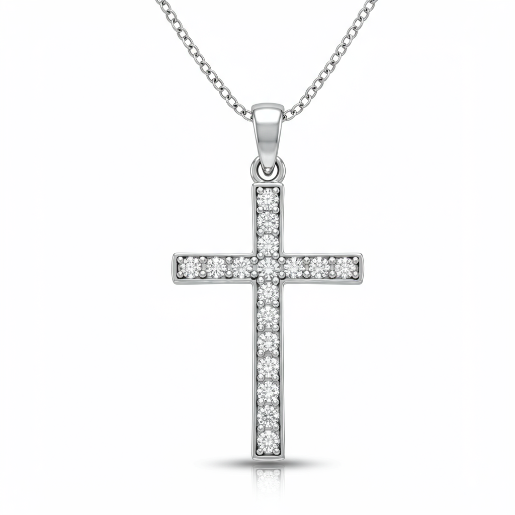 A sublime expression of faith and elegance, this 18K Gold Cross Necklace features a beautifully proportioned design. The surface is meticulously paved with 0.55 carats of brilliant VVS diamonds, catching the light with unparalleled radiance. Set in luxurious 18-karat white gold, the delicate craftsmanship ensures both durability and timeless beauty. This piece serves as a sophisticated statement of personal belief, ideal for daily wear or special occasions.