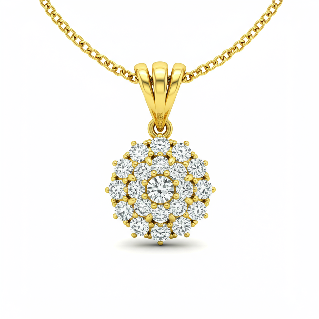 This exquisite Gold Necklace for women features a beautifully articulated diamond cluster pendant, symbolizing timeless grace and sophistication. Crafted in luxurious 18KT yellow gold, the delicate chain ensures comfortable wear, perfectly complementing the radiant centerpiece. The intricate setting allows maximum light reflection, enhancing the brilliance of every diamond. It is the perfect signature piece for both everyday elegance and major celebratory occasions.