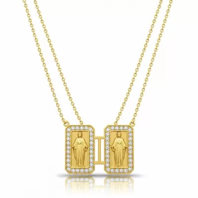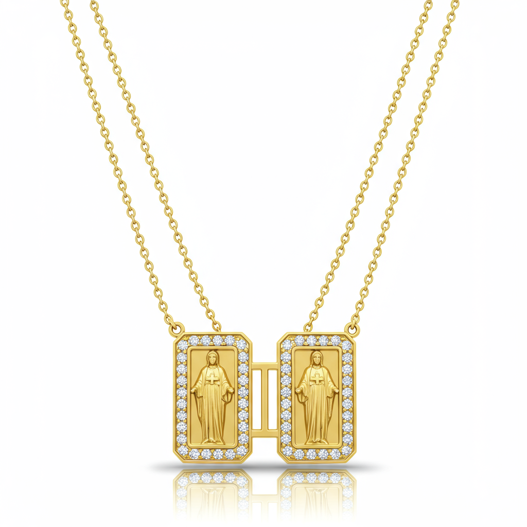 The Scapular Necklace reimagines a sacred tradition with refined luxury and modern sparkle. Crafted in radiant 18KT yellow gold, this piece features two delicate diamond-paved plaques connected by a fine, adjustable chain. The immaculate round diamonds, set in microscopic detail, ensure brilliant fire from every angle, adhering to VVS clarity standards. This elegant design offers both deep meaning and sophisticated wear, perfect for layering or as a standalone statement.