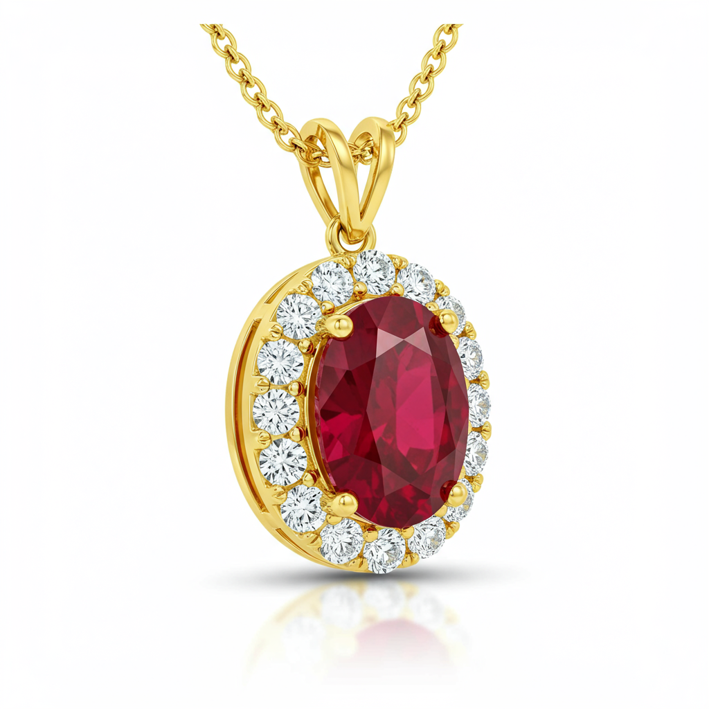 This exquisite necklace showcases a vivid central Oval Ruby, masterfully set against the warm glow of 14K yellow gold. Surrounding the deep crimson gemstone is a delicate halo of high-quality round brilliant diamonds, meticulously chosen for their exceptional fire and brilliance. The pendant hangs elegantly from a matching gold chain, offering a timeless blend of classic sophistication and modern luxury. This heirloom-quality piece is perfect for commemorating significant milestones or adding a touch of opulent color to any ensemble.