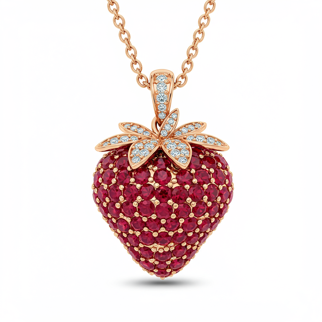 The Strawberry Necklace embodies playful sophistication, featuring a meticulously crafted strawberry silhouette adorned with vibrant gemstones. The rich 18KT Rose Gold setting perfectly complements the deep red hue of the primary stones, creating a luxurious and eye-catching focal point. Surrounding pave diamonds enhance the structure, offering brilliant sparkle. This piece drapes elegantly, making it a distinctive and delightful addition to any high-fashion collection.