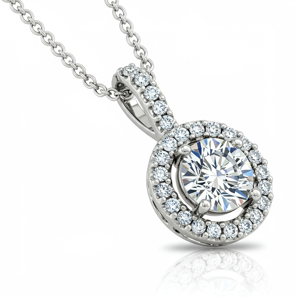 This exquisite diamond solitaire necklace captures timeless elegance, featuring a brilliant centerpiece surrounded by a delicate pave halo. Crafted in luminous 18KT white gold, the design allows maximum light refraction, ensuring spectacular sparkle from every angle. It rests gracefully on the décolletage, offering a sophisticated statement piece suitable for both daily wear and grand occasions. This pendant symbolizes enduring grace and refined luxury.
