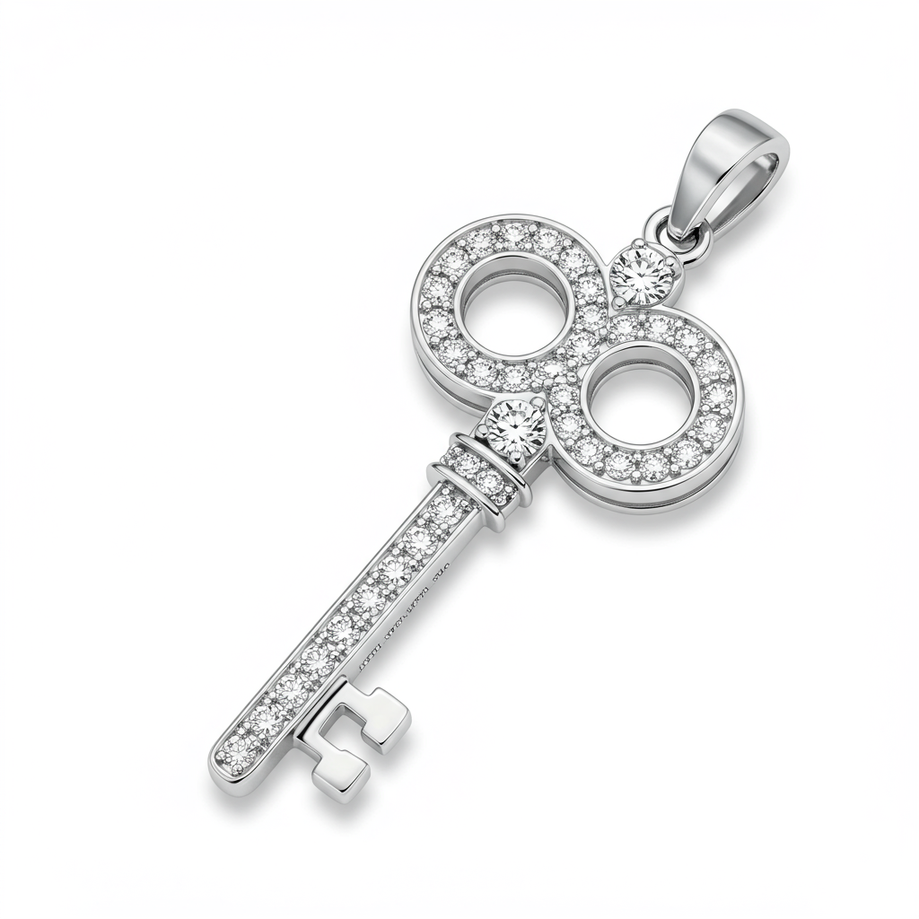 This exquisite Tiffany-inspired key pendant necklace, crafted in luminous 18KT white gold, symbolizes luxury and exclusive access. The intricate key design is meticulously set with brilliant-cut diamonds, emphasizing unparalleled sparkle and precision. A stunning center diamond serves as the focal point, radiating light and elegance. This piece is a timeless statement of sophistication, perfect for commemorating life's grandest milestones.