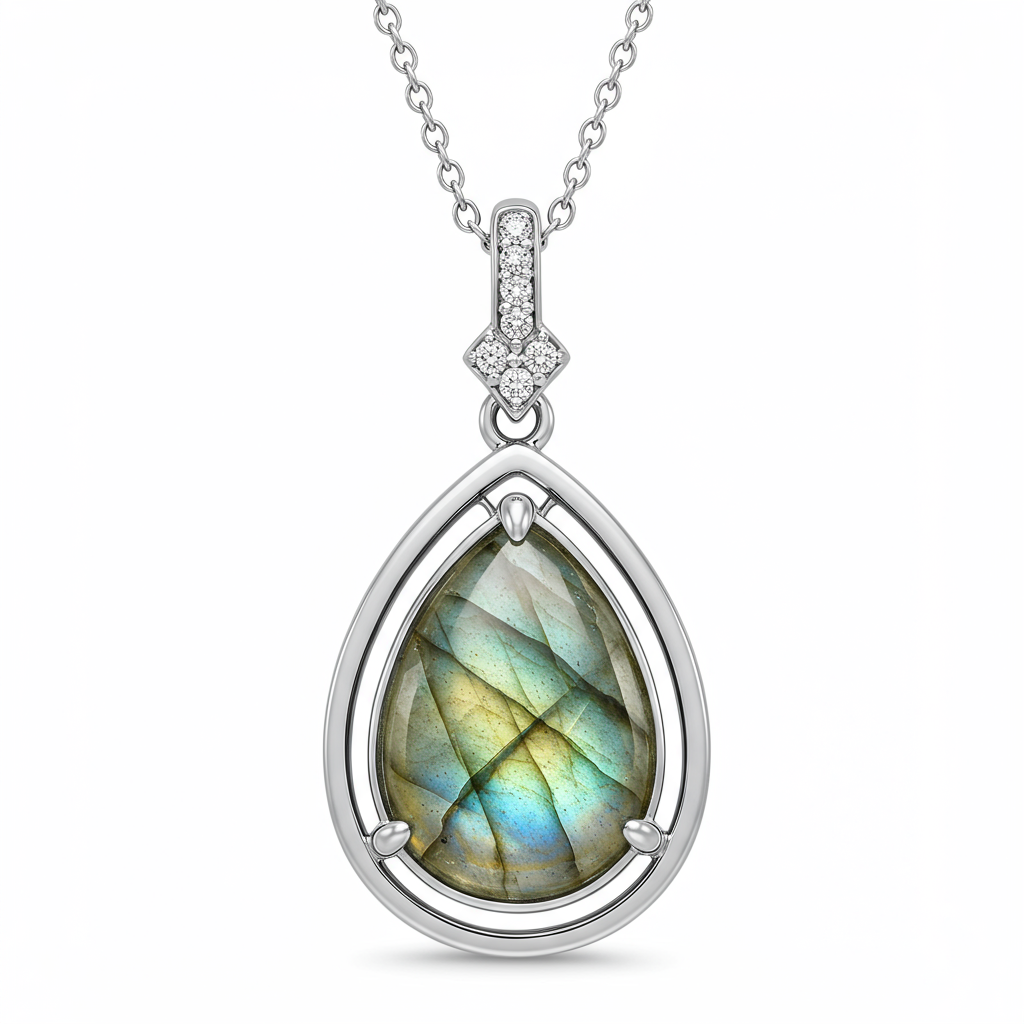 The Labradorite Necklace captures the ethereal magic of the Northern Lights in a wearable form. A central, exquisitely polished labradorite gemstone, known for its mesmerizing schiller effect, is set within a meticulously crafted 18KT white gold bezel. The pendant is subtly accented by a constellation of VVS-grade micro-pave diamonds along the bale, adding a brilliant, understated sparkle. This piece serves as a sophisticated statement, blending modern design with natural wonder and luxury materials.