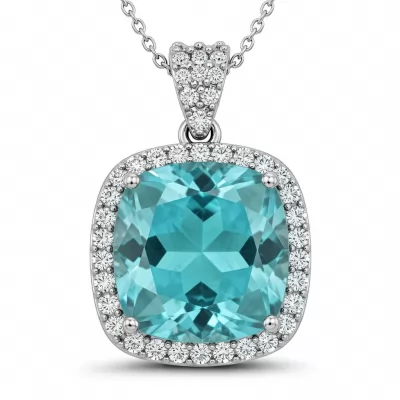 The Amazonite Necklace captures the tranquil beauty of seafoam green stones framed by brilliant accent diamonds. Crafted in luxurious 18KT white gold, this piece balances vibrant natural color with classic high-end elegance. A substantial central cushion-cut Amazonite dominates the pendant, suspended delicately on an adjustable chain. This necklace offers a sublime touch of sophistication, making it a perfect statement piece for any collection.