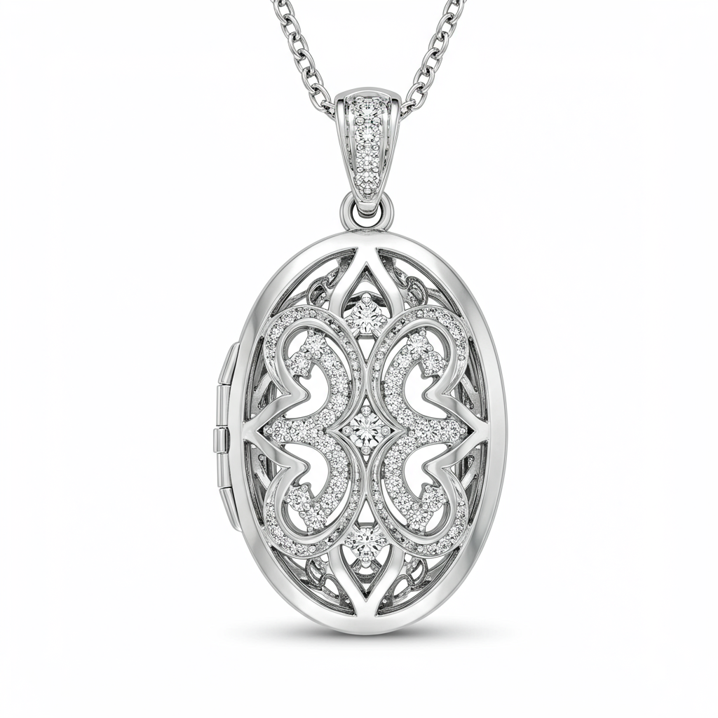 This elegant locket necklace is crafted in lustrous 18KT white gold, offering a secure and sophisticated setting for cherished memories. The circular frame is meticulously set with brilliant VVS diamonds, catching light from every angle. It features a streamlined hinge mechanism, ensuring seamless access to the interior compartment. Suspended from a delicate, matching chain, this piece is the ultimate heirloom. This design combines timeless aesthetic appeal with exceptional craftsmanship.