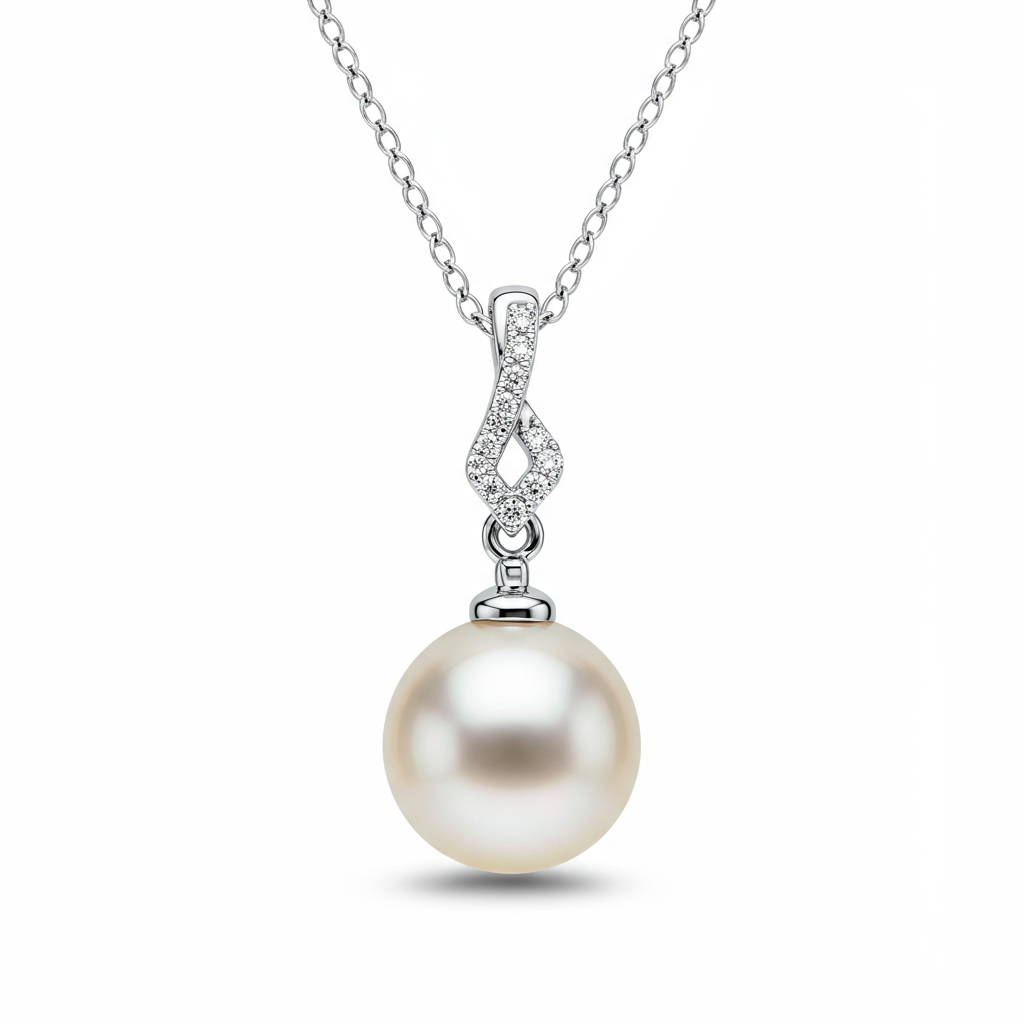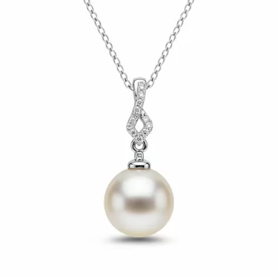 This exquisite pendant necklace captures timeless sophistication, featuring a magnificent South Sea cultured pearl suspended from a delicately paved bail. The 18KT white gold setting enhances the natural luster of the pearl, creating a captivating focal point. Accentuated by brilliant round diamonds of VVS clarity, this piece offers unmatched brilliance and elegance. It is the perfect heirloom piece to commemorate special milestones and elevate any formal attire.
