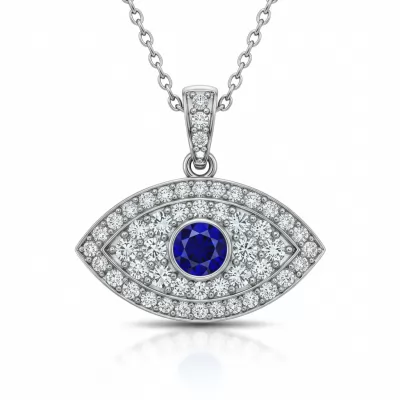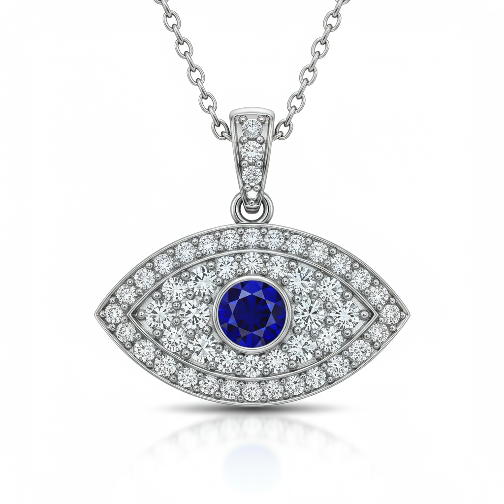 This exquisite Evil Eye Necklace is crafted in radiant 18KT white gold, symbolizing protection and timeless elegance. The central talisman features a striking design composed of meticulously set VVS round diamonds that form the outer halo. A vibrant blue sapphire creates the iris, anchored by a deep black diamond pupil. Suspended from a delicate adjustable chain, this piece offers a refined yet powerful statement and serves as a modern heirloom.