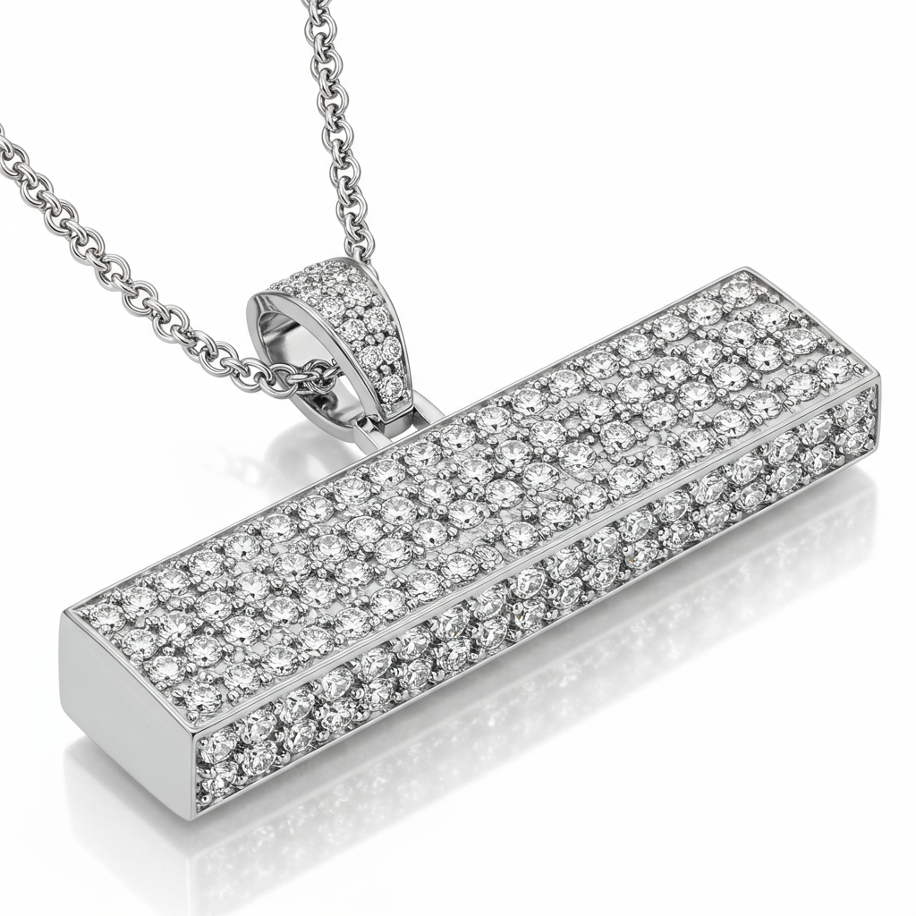 The Mens Necklace features a rugged yet refined diamond bar pendant suspended from a heavy, integrated 18KT white gold chain. This statement piece captures modern masculinity, utilizing sleek, clean lines and a flawlessly polished finish. A meticulous micro-pave setting showcases 1.55 carats of brilliant VVS diamonds, delivering exceptional, continuous sparkle. Designed for the discerning gentleman, this necklace offers sophisticated, high-end luxury suitable for any occasion.