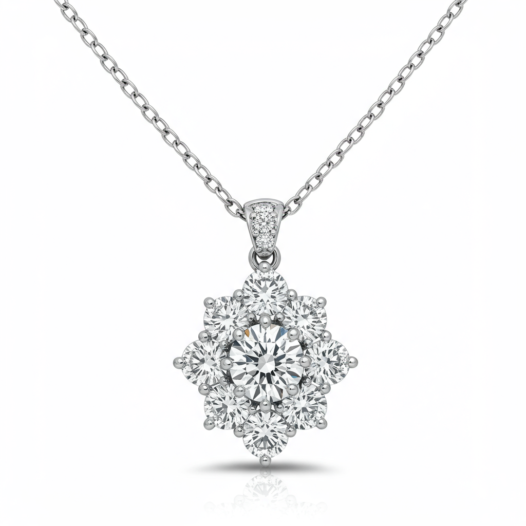 The Necklace And Necklace pendant is a masterpiece of light and luxury, designed to capture attention with every subtle movement. Crafted in radiant 18KT white gold, the central focus features a brilliant cluster of VVS diamonds creating the illusion of a magnificent solitaire. This delicate pendant is suspended from a fine chain, punctuated by small diamond accents for continuous sparkle. It is the definitive statement piece for sophisticated evening wear or elevated daily elegance.