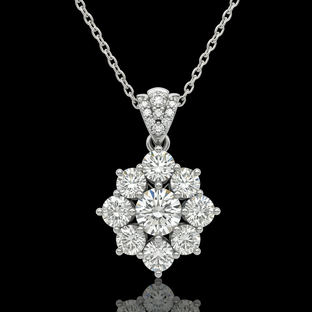 This exquisite pendant necklace embodies timeless elegance, centered around a brilliant cluster design. Crafted in luxurious 18KT white gold, it maximizes light return through superior diamond setting techniques. The piece features high-clarity VVS diamonds, offering unmatched sparkle and fire. It is an ideal statement accessory for formal events or adding everyday glamour to your wardrobe.