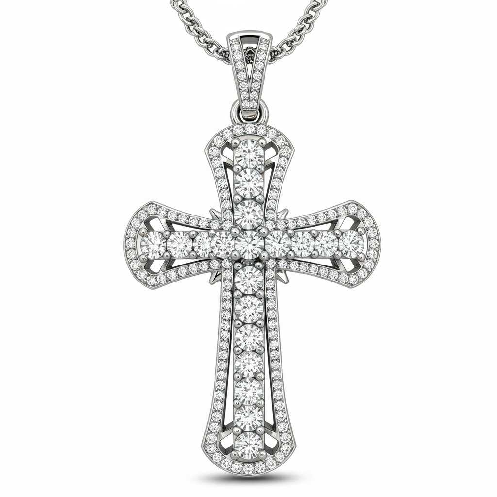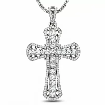 The Christian Cross Necklace is a timeless symbol of faith, exquisitely crafted in radiant 18KT white gold. This delicate yet impactful pendant features a surface completely paved with brilliant round VVS diamonds, catching the light from every angle. The high-polish finish contrasts beautifully with the dazzling stone setting, creating a piece of unmatched spiritual elegance. Suspended from a slender chain, this necklace offers a graceful statement of devotion and luxury, designed for daily wear or special occasions.