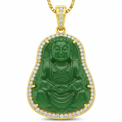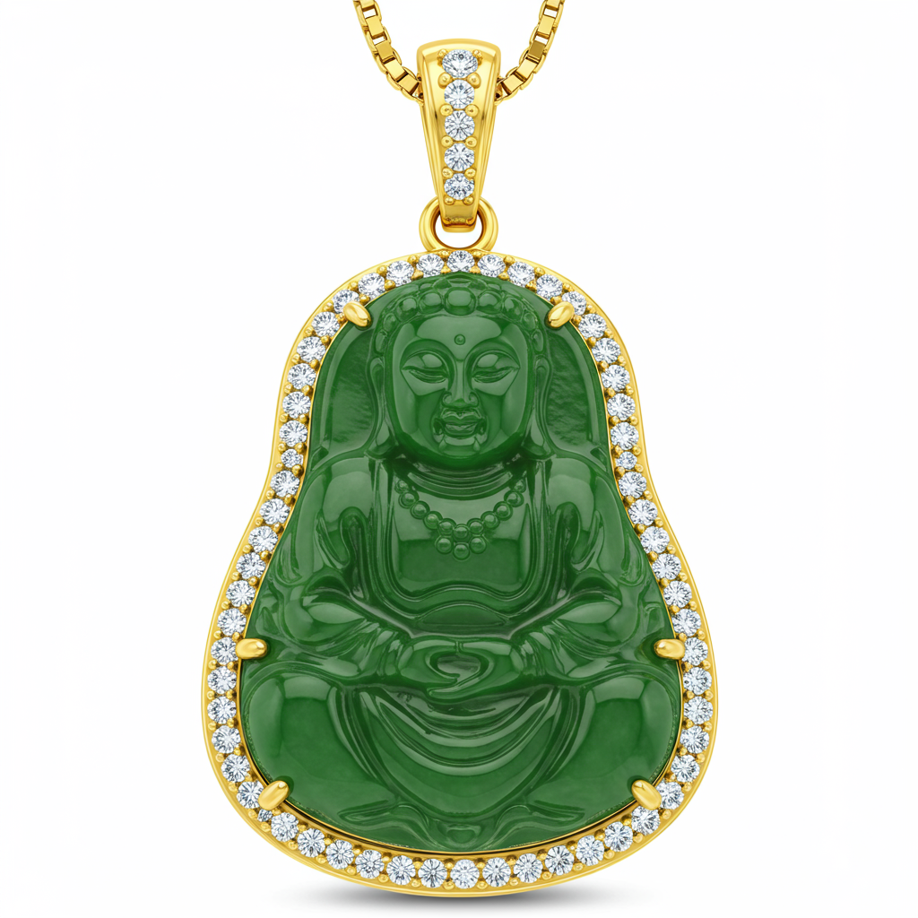 The Jade Buddha Necklace is a testament to serenity and exquisite craftsmanship, featuring a finely carved natural Burmese Jadeite Buddha at its center. This spiritual centerpiece is crowned by a high-polish 18KT yellow gold bail, meticulously paved with VVS clarity round brilliant diamonds. Representing prosperity and protection, this timeless pendant hangs gracefully, offering both meaningful symbolism and unparalleled luxury. It serves as a striking statement piece perfect for daily wear or special occasions.