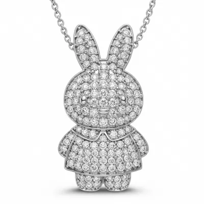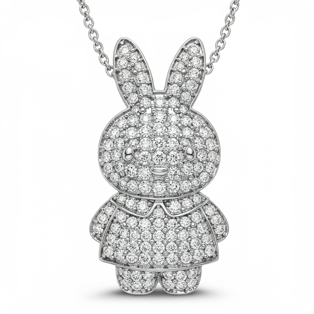 The Miffy Necklace embodies playful elegance through its sophisticated silhouette, crafted entirely from lustrous 18KT white gold. This delicate pendant features a meticulously set collection of VVS diamonds, catching light with exceptional brilliance. The design balances modern minimalism with a hint of whimsy, making it perfect for daily wear or layering. It serves as a timeless emblem of refined taste and impeccable craftsmanship.