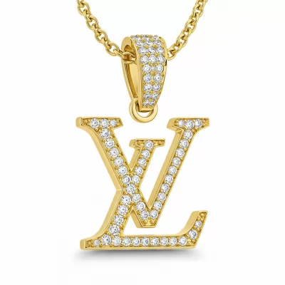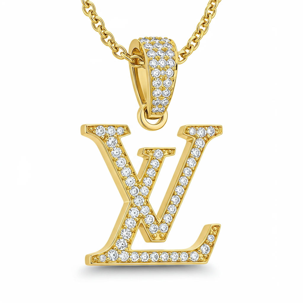 The Louis Vuitton Necklace is an iconic tribute to timeless luxury, meticulously crafted in rich 18KT yellow gold. This statement piece features the classic LV monogram silhouette, entirely paved with brilliant VVS round diamonds for unparalleled radiance. Suspended from an elegant chain, the pendant captures light with every movement, symbolizing sophistication and elite heritage. It is the perfect embodiment of high fashion translated into fine jewelry, designed for the discerning collector.