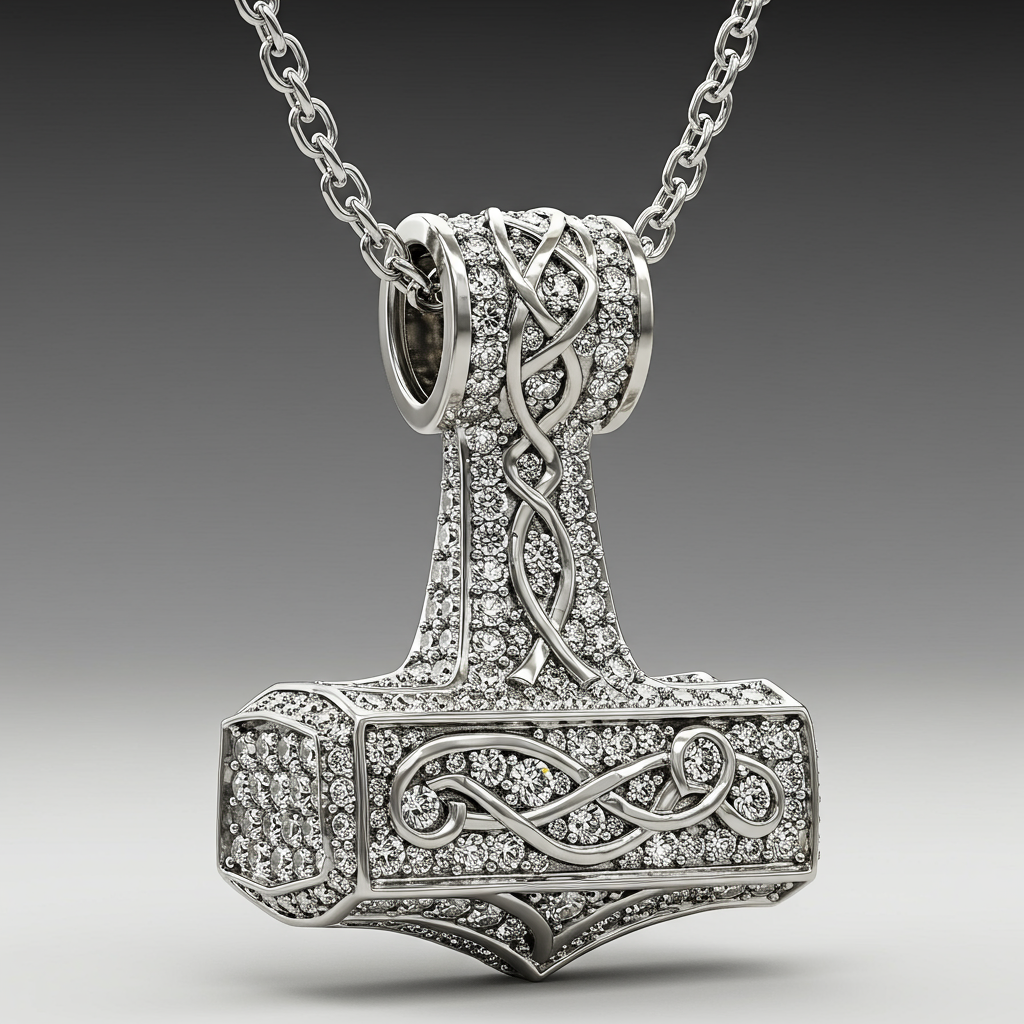 The Mjolnir Necklace is a masterful rendition of legendary strength, cast in lustrous 18KT white gold. This striking symbolic pendant features clean lines and a meticulously crafted hammerhead, fully paved with exceptional VVS diamonds. It serves as both a powerful statement and a testament to superior artisanal precision. Wear the symbol of might and protection every day, fusing mythology with modern luxury.