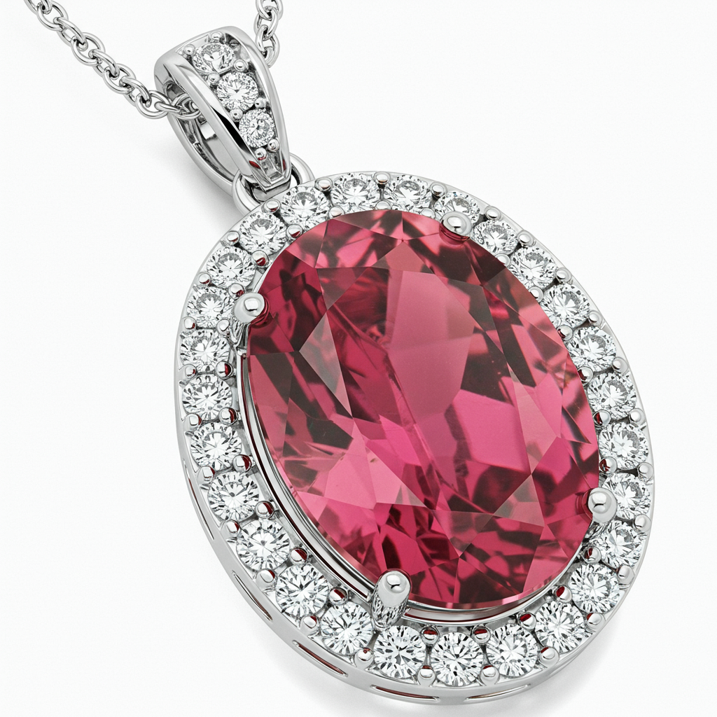 This exquisite Pink Tourmaline Necklace captures vibrant color and timeless elegance. It features a stunning, rich oval-cut pink tourmaline embraced by a brilliant halo of micro-set VVS accent diamonds. Crafted meticulously in 18KT white gold, the delicate setting maximizes light return and emphasizes the stone's saturated color. This piece offers a sophisticated statement, perfect for high-profile occasions or elevating everyday luxury.