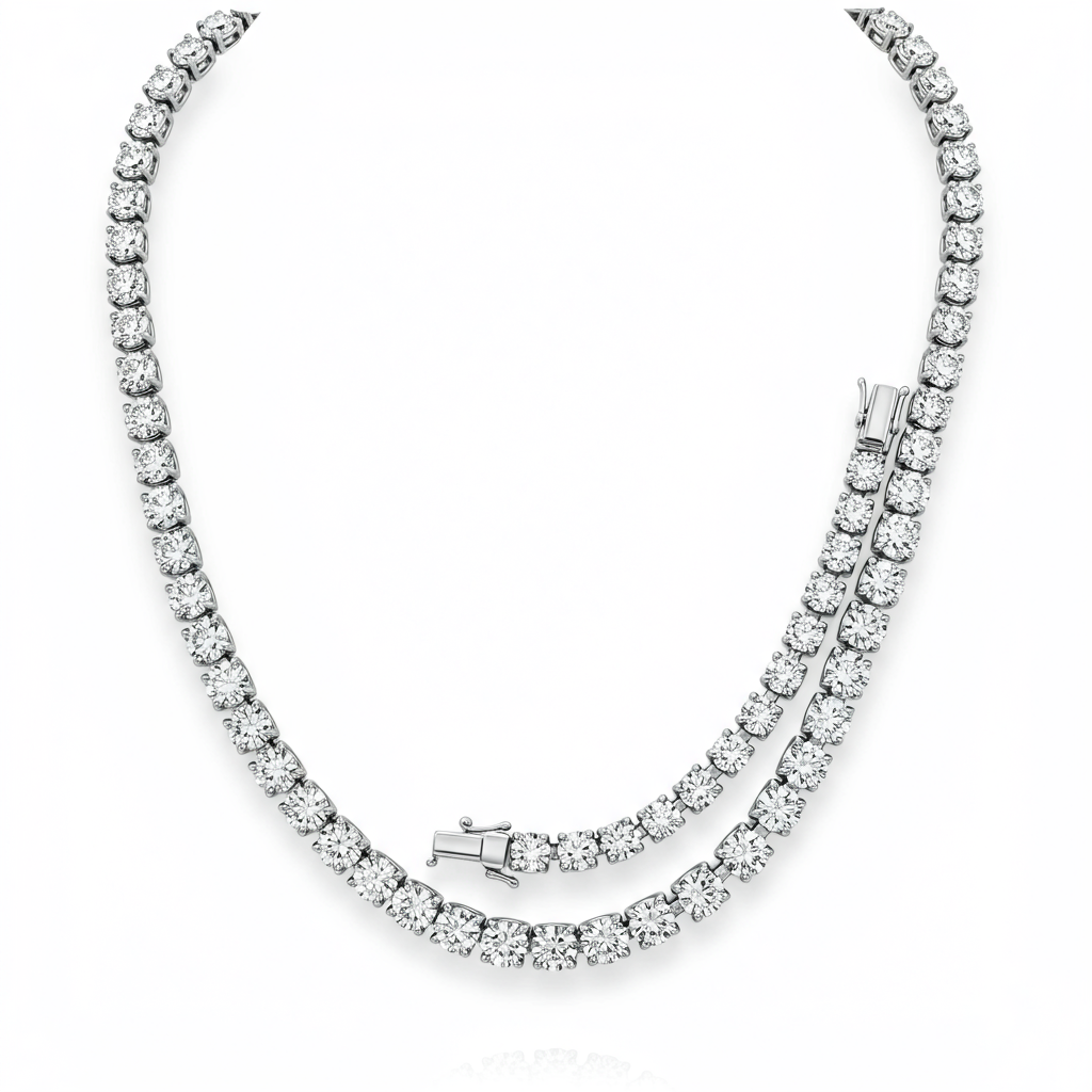 This exquisite Diamond Necklace embodies timeless elegance and unmatched brilliance, designed for the woman who appreciates fine craftsmanship. Featuring a seamless sequence of VVS round brilliant diamonds set in lustrous 18KT white gold, the piece drapes beautifully around the neck. Its flexible construction ensures supreme comfort while maximizing light reflection from every angle. This stunning tennis necklace serves as the ultimate statement piece for major life celebrations and formal events.