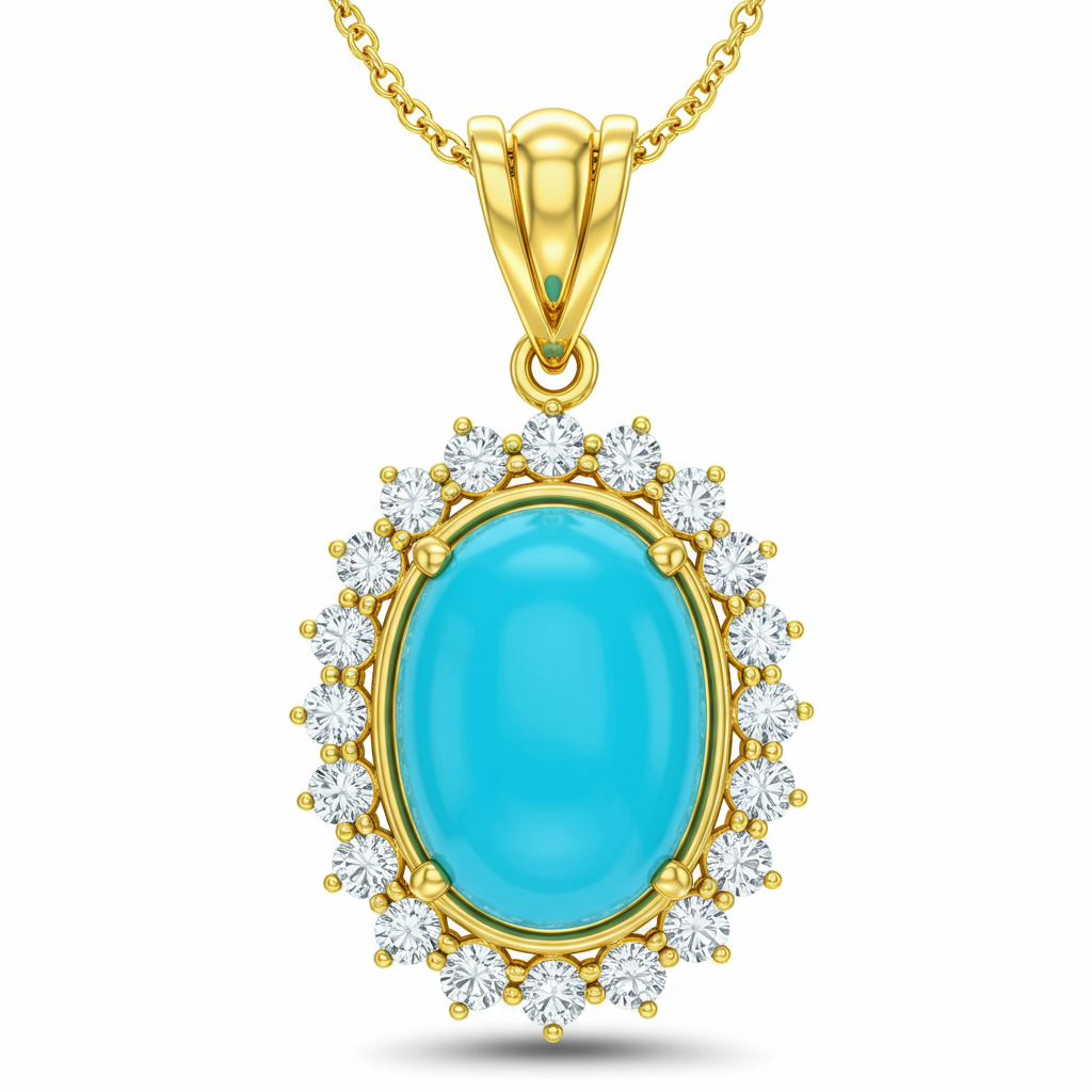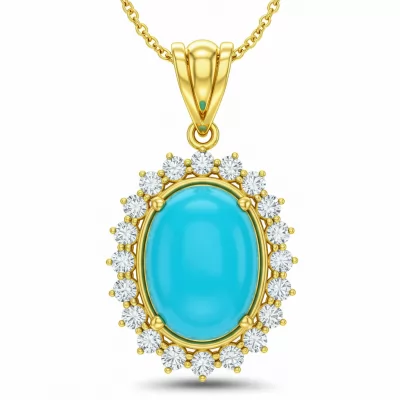 The Turquoise Necklaces piece exudes oceanic elegance, pairing vibrant natural turquoise with brilliant diamond accents. Set in lustrous 18KT yellow gold, this necklace features a perfectly balanced drop design. The central turquoise stone captures the calming essence of the sea, making it a powerful statement piece. This exquisite jewelry promises unmatched sophistication and a timeless appeal for any collection.