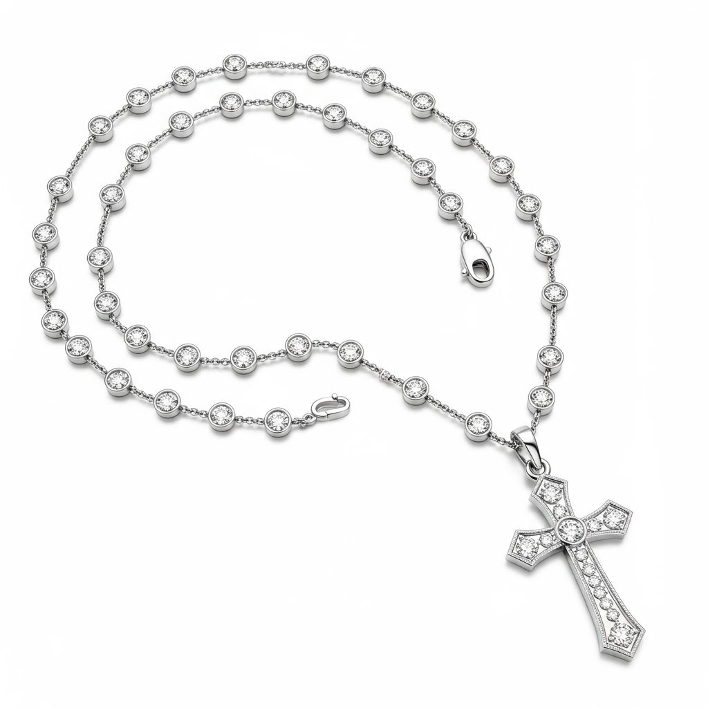 This magnificent Rosary Necklace redefines spiritual elegance through modern luxury. Expertly crafted in radiant 18KT white gold, the design features a sequence of flawlessly cut VVS diamonds meticulously bezel-set along the delicate chain, leading to an exquisite focal pendant. This piece serves as a timeless expression of faith and sophistication, perfect for commemorating life's most cherished milestones. Its exceptional craftsmanship ensures a brilliant sparkle with every movement.