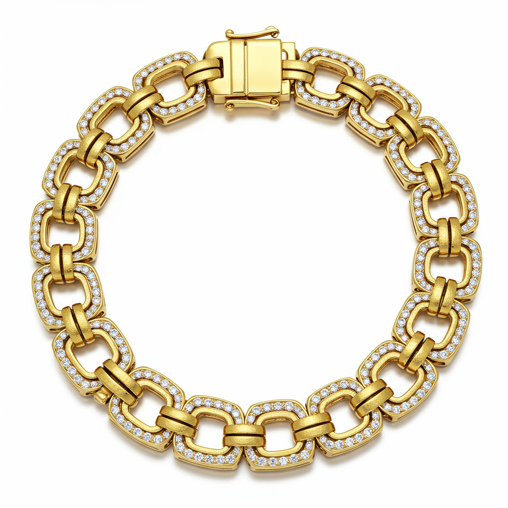 The Byzantine Necklace is a breathtaking tribute to ancient artistry, featuring intricate geometric links crafted in opulent 18KT yellow gold. This statement piece incorporates meticulously placed, high-clarity diamonds to accentuate the complex, rope-like structure synonymous with Byzantine design. Offering substantial weight and exceptional craftsmanship, it drapes elegantly, making it a focal point for any high-fashion ensemble. This heirloom-quality necklace ensures eternal sophistication and timeless grandeur.