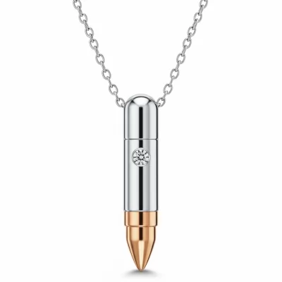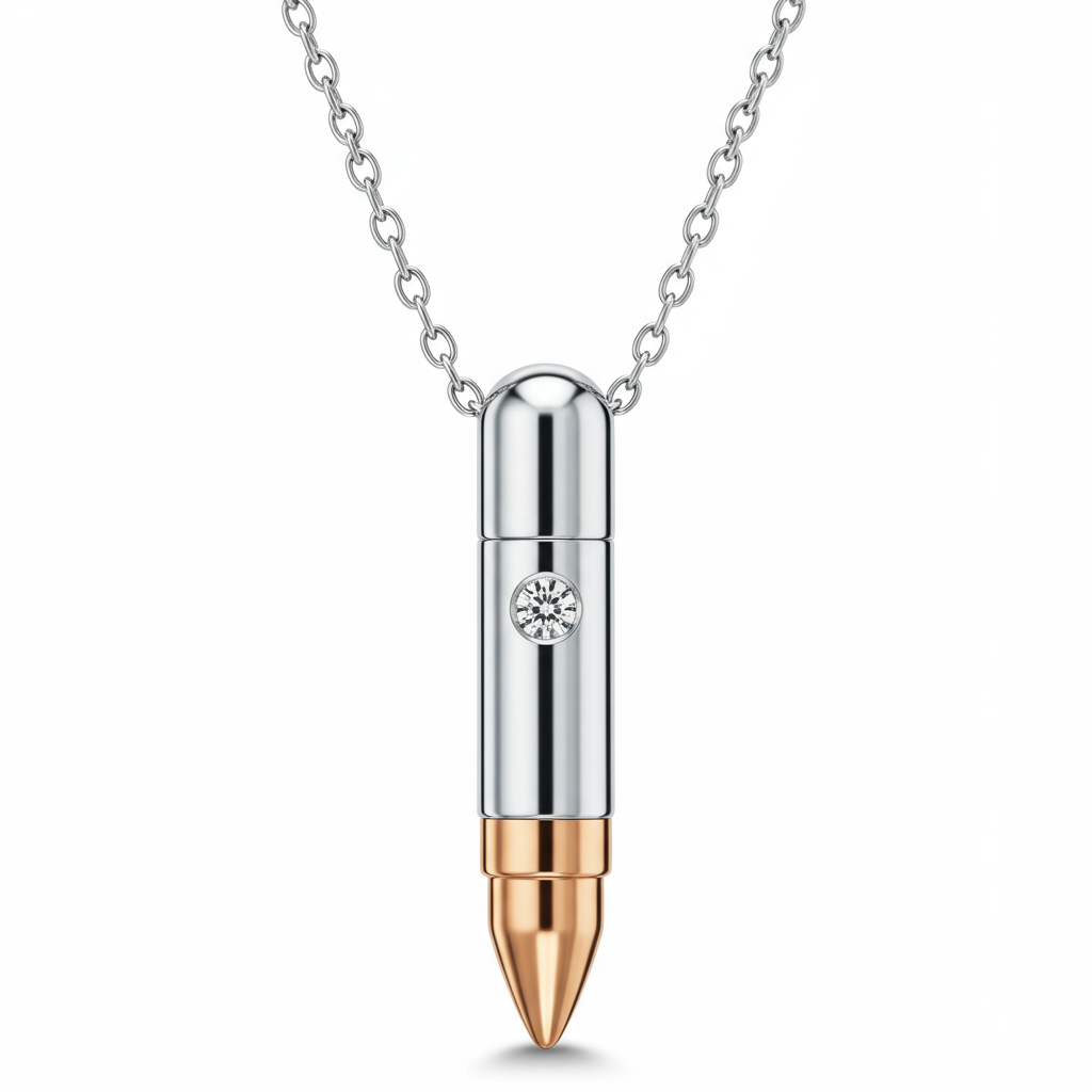 The Bullet Necklace is a bold statement piece, symbolizing strength and unwavering protection for the wearer. Crafted in luminous 18KT white gold, the tapered cylindrical pendant features a meticulously set VVS round diamond at its base, acting as the primary focal point. This architectural design perfectly blends industrial edge with high-fashion luxury, resulting in a striking silhouette. It hangs elegantly from a finely wrought matching chain, capturing light with every confident movement.