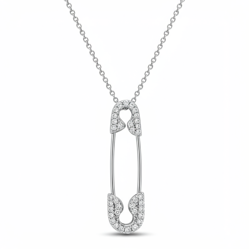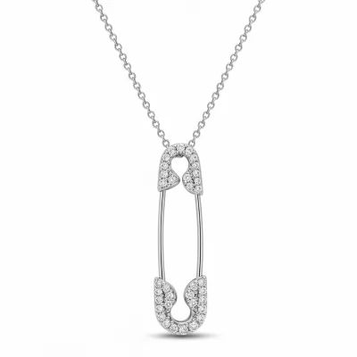 The Safety Pin Necklace redefines modern luxury with a bold, contemporary edge. Crafted in lustrous 18KT white gold, the iconic safety pin silhouette is meticulously paved with brilliant VVS diamonds. This unique statement piece combines rebellious style with sophisticated craftsmanship, offering a versatile accessory for everyday wear or elevated evening attire. It hangs from a delicate chain, securing its place as a striking symbol of individuality and fine jewelry artistry.