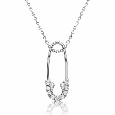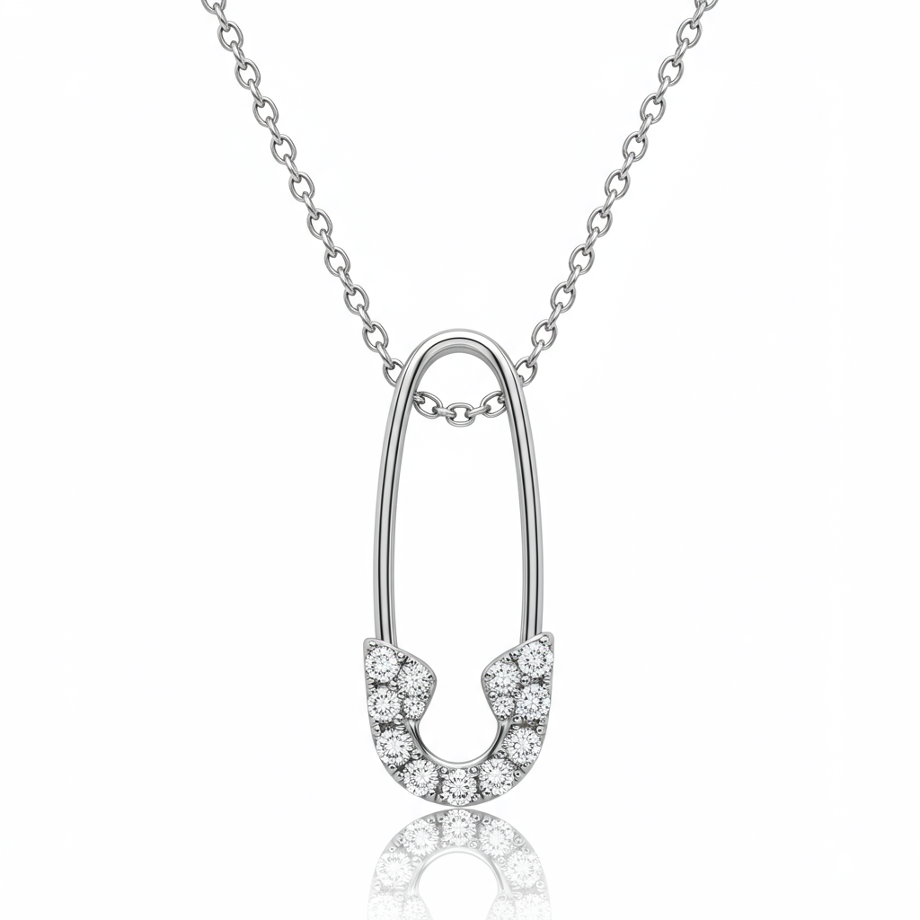 This avant-garde Safety Pin Necklace transcends traditional jewelry, offering a profound statement piece symbolizing security, unity, and resilience. Crafted meticulously in 18KT white gold, the functioning safety pin design is fully paved with brilliant VVS diamonds, catching light from every angle. It hangs delicately on an adjustable chain, marrying utility with undeniable luxury. This necklace is an exceptional gift for those who appreciate contemporary design infused with deep, personal meaning.