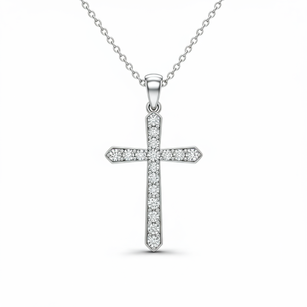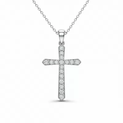 This exquisite Diamond Cross Necklace is a timeless symbol of faith, beautifully rendered in lustrous 18KT white gold. The delicate cross design is fully illuminated by a precise micro-pave setting, showcasing brilliant VVS clarity diamonds. The pendant is suspended from an elegant, fine chain, ensuring it rests perfectly on the collarbone. This piece blends spiritual significance with contemporary high-jewelry artistry, making it an essential addition to any refined collection.