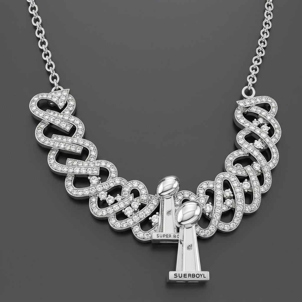 This extraordinary necklace, inspired by the pinnacle of sports luxury, features a personalized, sculptural pendant suspended from a brilliant diamond station chain. Crafted meticulously in highly polished 18KT white gold, the centerpiece is fully adorned with hundreds of micro-pave set, flawless VVS diamonds. This iconic piece serves as a powerful symbol of achievement and exclusive elegance, reflecting light with unmatched brilliance. It represents the perfect fusion of contemporary customization and timeless high jewelry design.