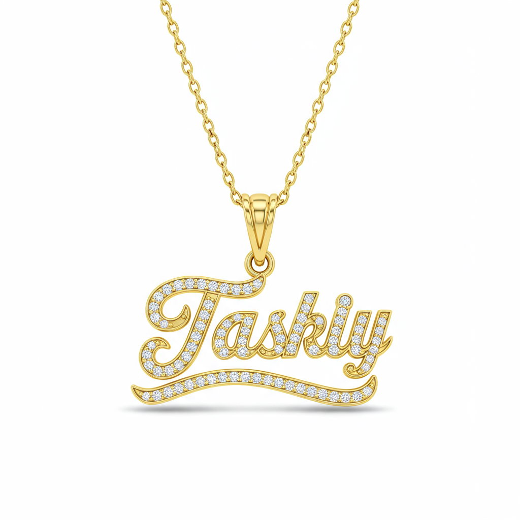 The Gold Name Necklace offers a timeless and deeply personal statement, handcrafted in lustrous 18KT yellow gold. This exquisite piece features a custom script pendant entirely paved with brilliant VVS quality diamonds, ensuring maximum sparkle. Suspended elegantly from a delicate chain, it rests beautifully against the collarbone, symbolizing identity and sentimentality. A perfect piece for celebrating milestones or as a cherished everyday signature accessory.