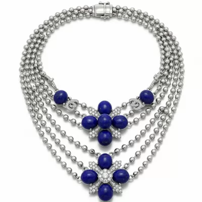 This luxurious Native American-inspired necklace reimagines traditional artistry through high-end modern craftsmanship. Crafted in polished 18KT white gold, the design features intricate beadwork and a striking centerpiece. It is adorned with vibrant cabochon Lapis Lazuli stones, lending a depth of color characteristic of regional jewelry. Brilliant VVS diamonds provide shimmering accents, elevating this statement piece to an heirloom quality treasure.