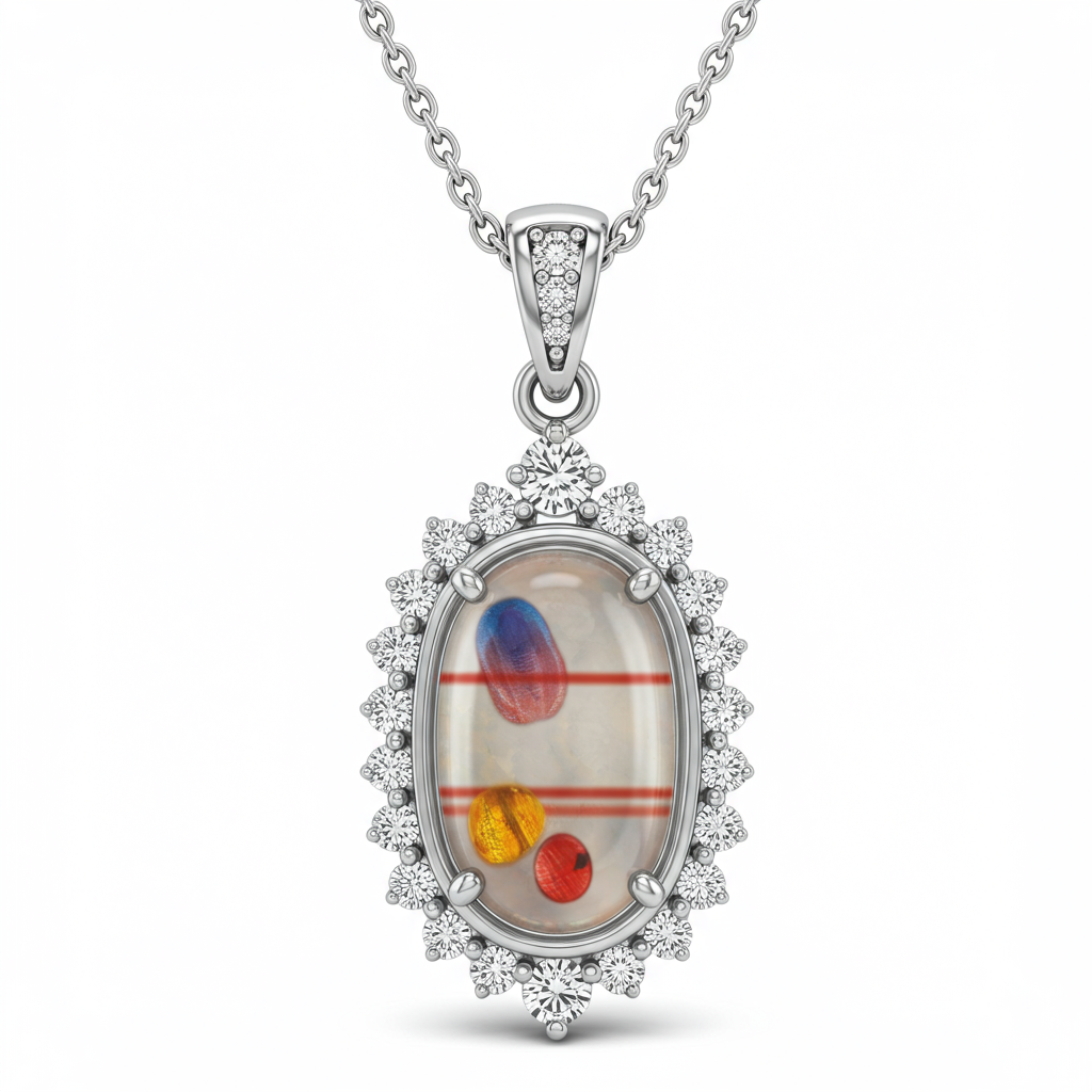 Embrace personal elegance with this extraordinary 18KT white gold Mood Necklace. The centerpiece is a magnificent cushion cabochon that shifts color instantly, reflecting the wearer's current emotional state, embodying deep connection and mystery. Surrounding the mesmerizing stone are delicate VVS diamonds, adding a subtle halo of unmatched brilliance. This unique pendant hangs from a perfectly weighted chain, ensuring a graceful and luxurious drape, making it an ideal statement piece or meaningful gift.