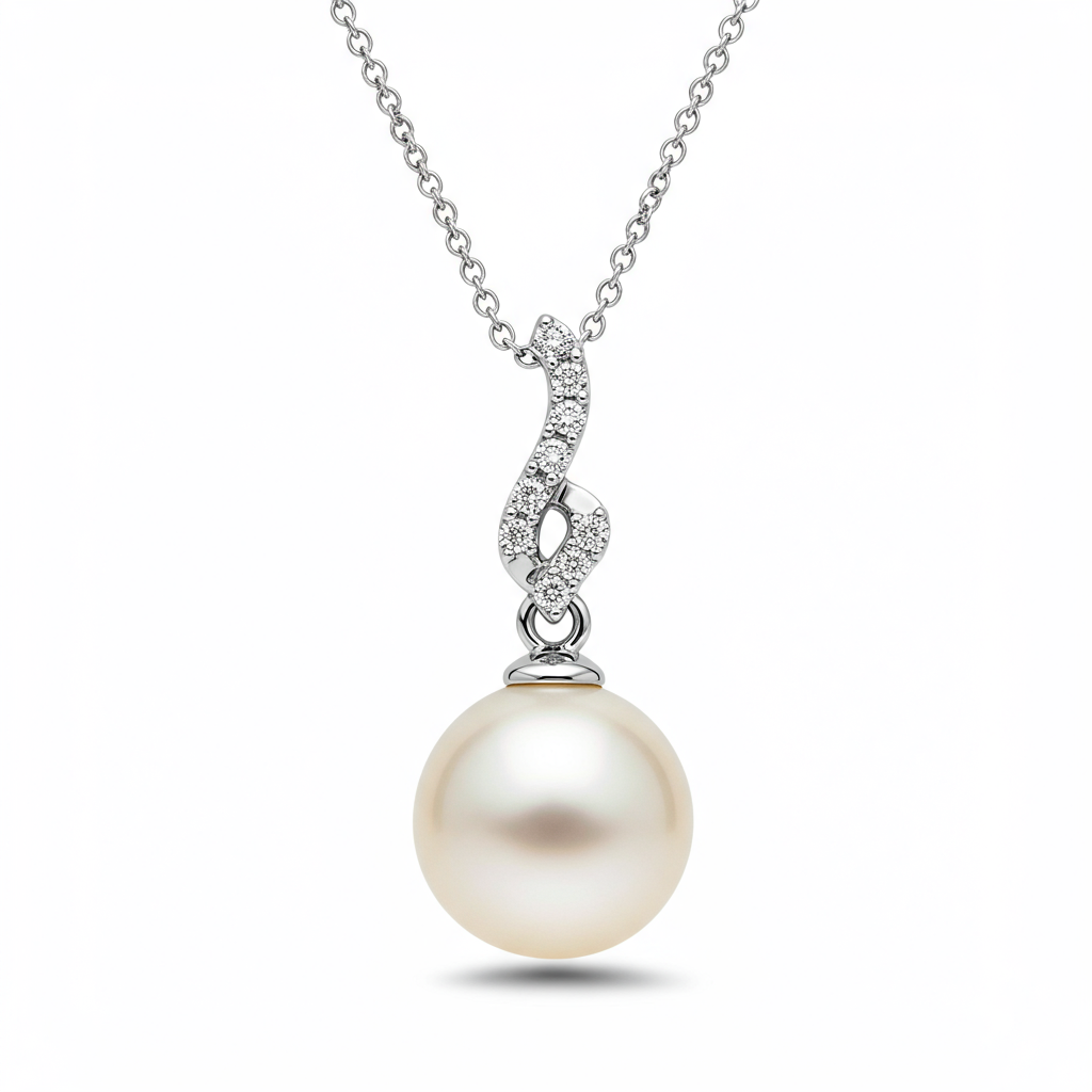 This exquisite Necklace Pearl Necklace blends timeless elegance with modern sparkle. Featuring a central, lustrous 9mm Freshwater pearl suspended beneath a brilliant cluster of VVS G color diamonds, it offers unparalleled sophistication. Set meticulously in 18KT white gold, the design captures light beautifully, enhancing the natural glow of the pearl. This versatile piece is perfect for bridal wear or as an heirloom quality gift, radiating grace and refinement.