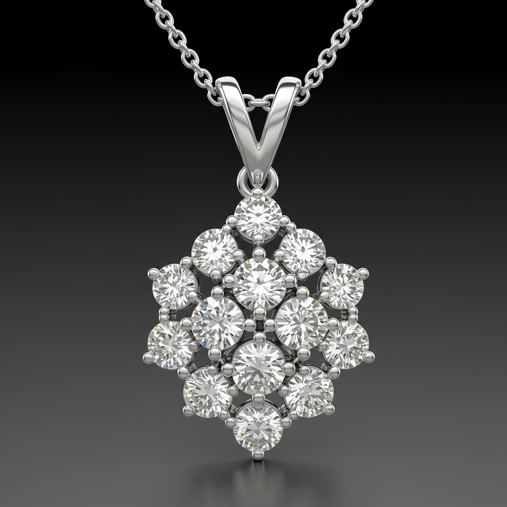 The Necklace Silver Necklace embodies timeless elegance with its meticulously crafted diamond cluster design. Set in lustrous 18KT white gold, this exquisite piece features a brilliant central diamond surrounded by a sparkling halo of smaller accents. The exceptional VVS clarity and G-H color ensure breathtaking fire and brilliance from every angle. It is an ideal statement piece, perfect for enhancing any sophisticated attire or marking life's most cherished moments.