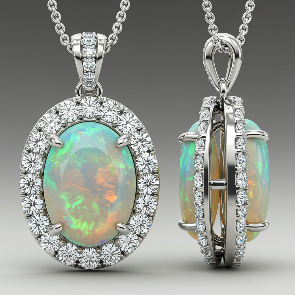 This exquisite Opal Necklace captures the ethereal beauty of a central, perfectly polished Australian opal, renowned for its mesmerizing fire and dynamic play-of-color. Encircling the focal point is a meticulous halo of brilliant-cut VVS diamonds, set in shimmering 18KT white gold. The classic solitaire pendant design ensures maximum light interaction, transforming any occasion into a moment of radiant elegance. Suspended from a delicate adjustable chain, this piece is a timeless embodiment of luxury and sophisticated artistry.