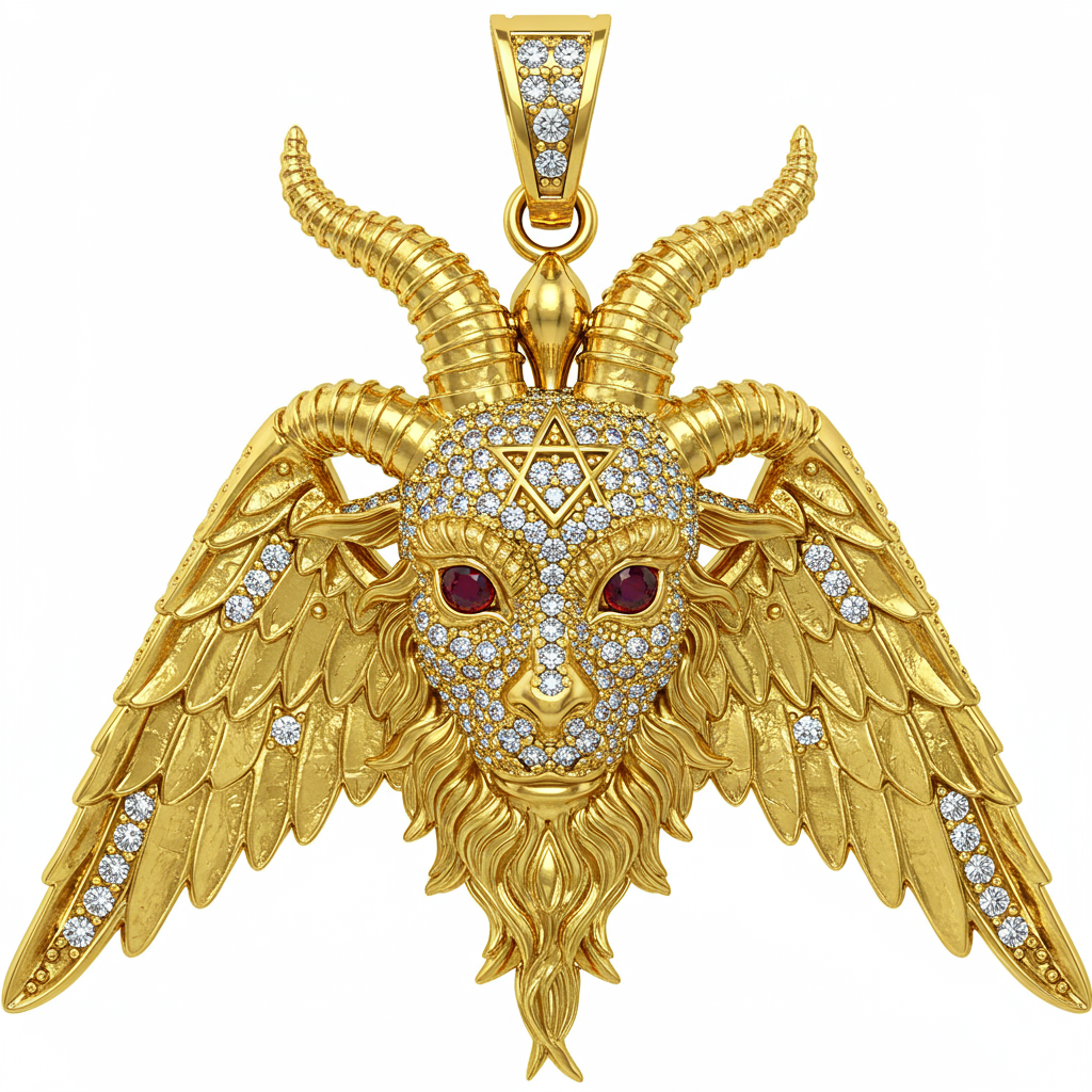 Embrace the mystic allure with the Baphomet Necklace, a profound statement piece symbolizing duality and balance. Expertly crafted in 18KT yellow gold, the detailed occult sigil is fully articulated, achieving a three-dimensional sculpture. The entire surface is meticulously set with VVS natural diamonds, ensuring scintillating brilliance from every angle. This luxurious amulet serves as a conversation piece, marrying high fashion jewelry with potent symbolism.