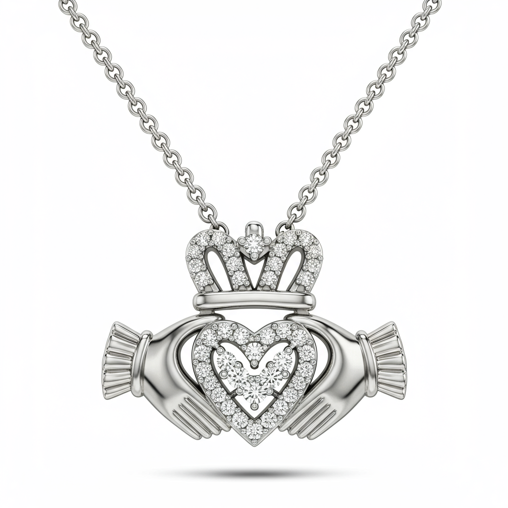 The Claddagh Necklace captures the Irish symbols of love, loyalty, and friendship through its iconic heart, crown, and hands motif. Crafted in lustrous 18KT white gold, this delicate pendant features brilliant micro-pave set VVS diamonds along the heart outline. This enduring piece is perfect for symbolizing a deep, cherished connection, offering both historical significance and contemporary elegance. It is an essential, meaningful accessory suitable for daily wear or special occasions.