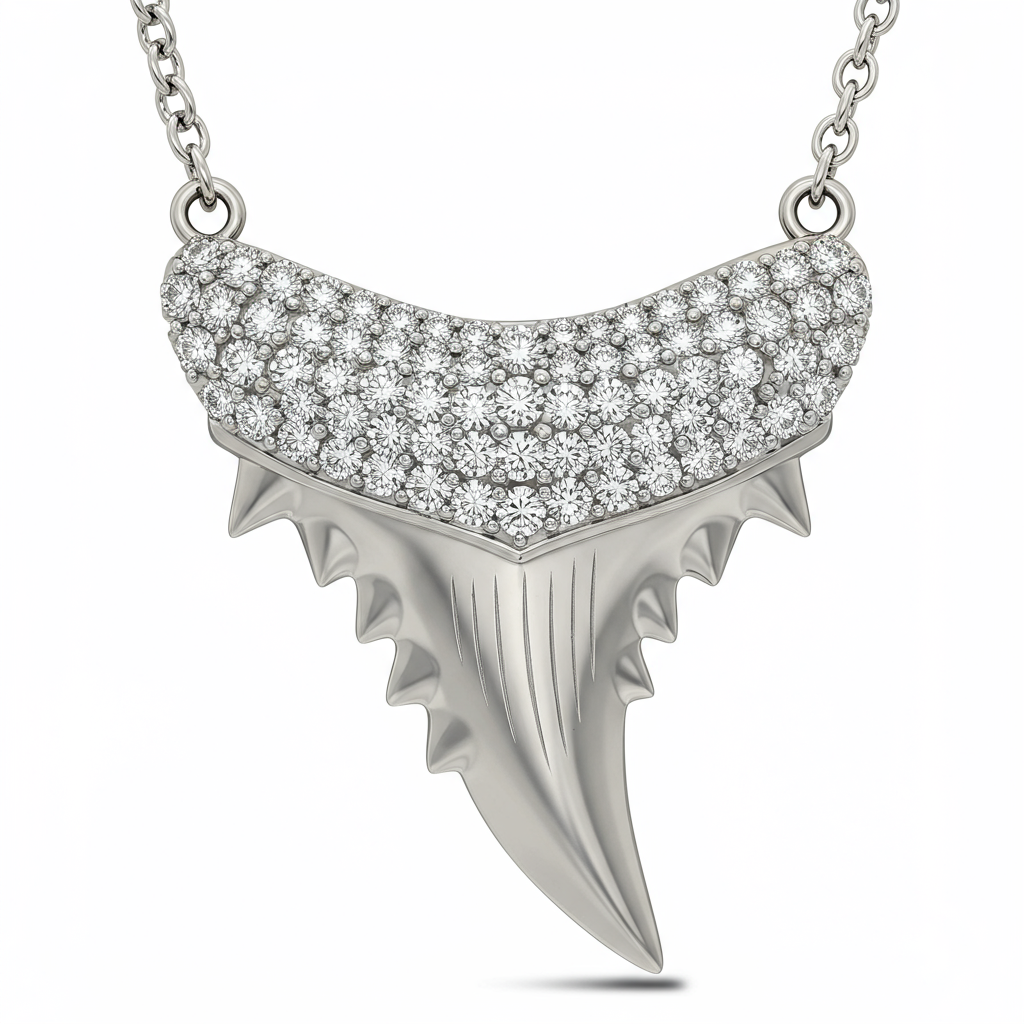 The Shark Tooth Necklace captures the raw power and elegance of the ocean's apex predator. Crafted in lustrous 18KT white gold, this formidable pendant is meticulously micro-pave set with brilliant VVS diamonds, creating a dazzling texture across its aggressive, natural silhouette. Suspended from a delicate yet strong chain, the piece balances modern design with primal inspiration. It is a bold, luxurious statement accessory designed for those who command attention.