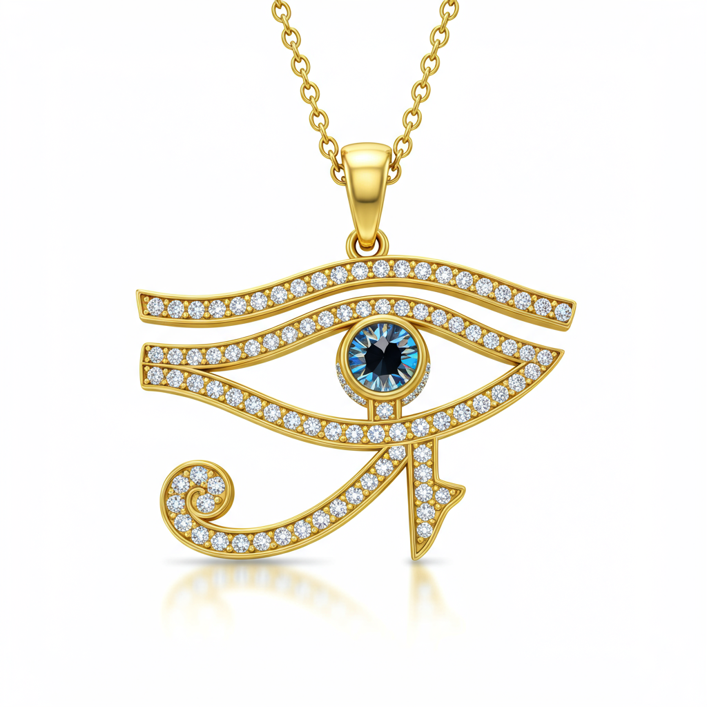 The Eye Of Horus Necklace is a powerful emblem of protection and royal power, rendered exquisitely in brilliant 18KT yellow gold. This iconic Egyptian symbol is meticulously detailed and fully paved with brilliant-cut, high-clarity diamonds. The piece captures ancient mythology through modern high-jewelry craftsmanship, offering both striking visual appeal and profound meaning. Suspended from a fine cable chain, this pendant makes a bold statement of confidence and enduring elegance.