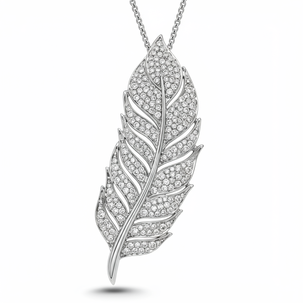 The Feather Necklace embodies graceful freedom and exquisite craftsmanship. Designed in highly polished 18KT white gold, the delicate feather motif is entirely encrusted with brilliant VVS diamonds in a meticulous pave setting, capturing light with every movement. This symbolic piece hangs from a slender chain, offering a stunning and timeless addition to any fine jewelry collection. It serves as a beautiful metaphor for lightness and elegance, perfect for sophisticated daily wear or special occasions.