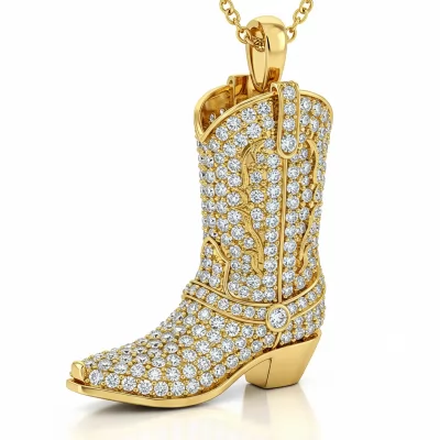 Embrace the spirit of the Wild West with this exquisite Cowboy Boot Necklace, a miniature masterpiece crafted in luminous 18KT yellow gold. The iconic silhouette is entirely blanketed in a dazzling display of micro-pave set VVS diamonds, capturing light with every movement. This unique charm pendant hangs elegantly from a delicate chain, offering a perfect blend of high fashion glamour and adventurous Americana. It serves as a striking statement piece for the modern connoisseur of fine jewelry.