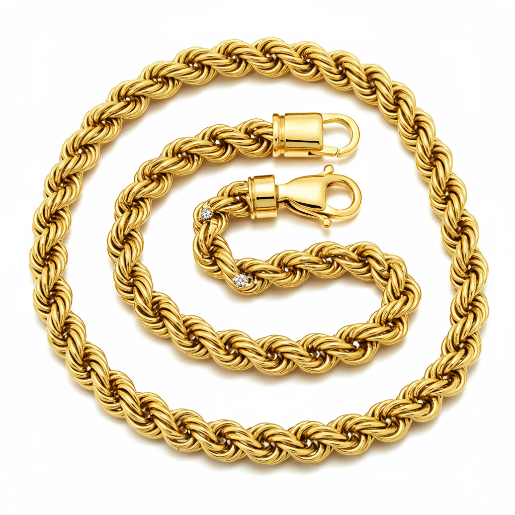 This timeless Gold Rope Necklace embodies classic elegance and luxurious craftsmanship. Meticulously fashioned from 18KT yellow gold, its finely woven links create a stunning texture that catches the light from every angle. It provides a substantial yet comfortable drape, perfect for solo wear or layering with fine pendants. A true heirloom piece, this necklace secures with a durable diamond-accented lobster clasp, promising enduring beauty and style.