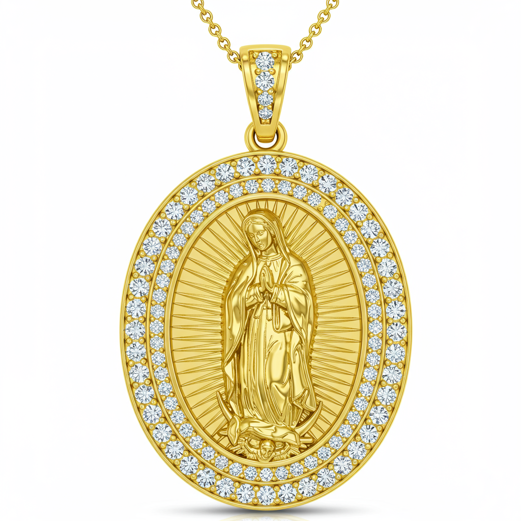 This exquisite Virgin Mary necklace is crafted in luminous 18KT yellow gold, offering a timeless symbol of faith and devotion. The delicate pendant features a meticulously detailed portrait bordered by a brilliant halo of micro-pave set diamonds. Designed for daily wear, this piece hangs gracefully from a finely wrought gold chain, symbolizing purity and protection. It serves as a profound heirloom quality piece, blending spiritual reverence with high craftsmanship.