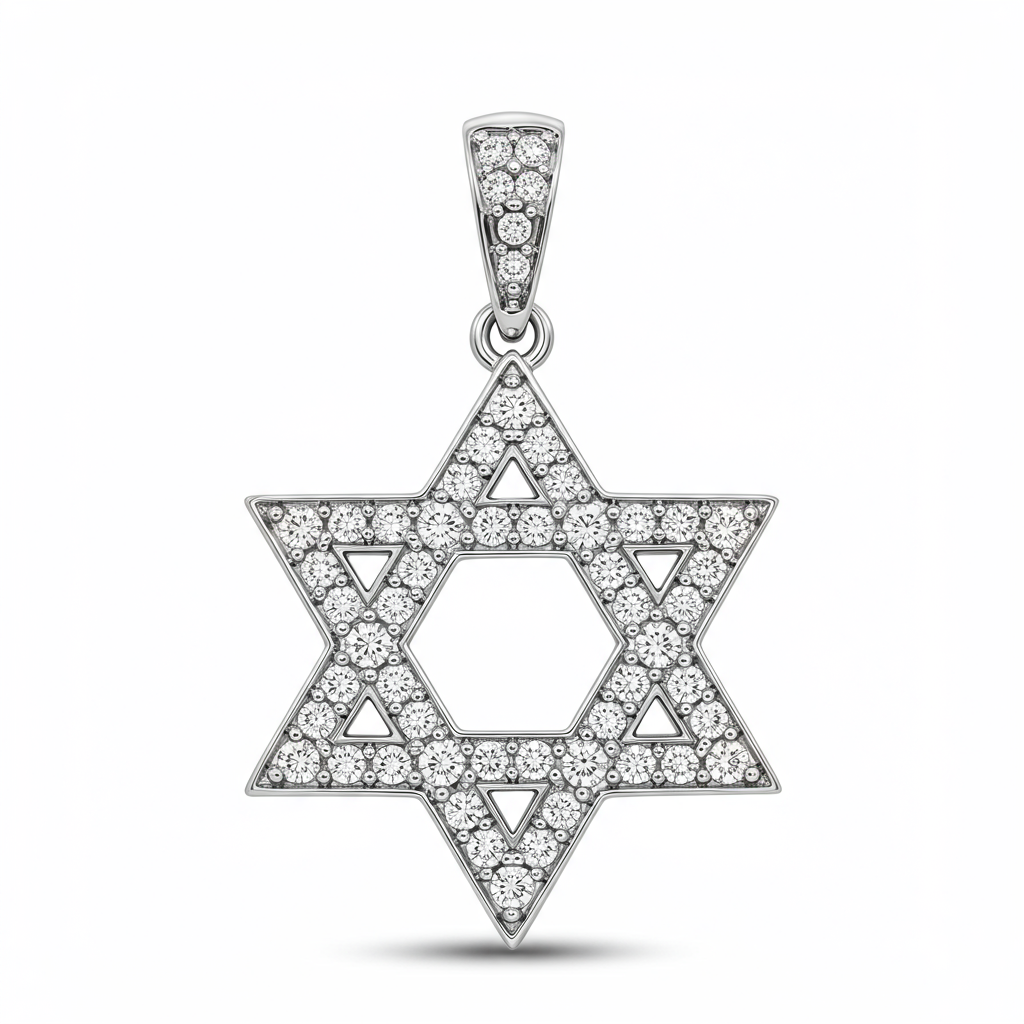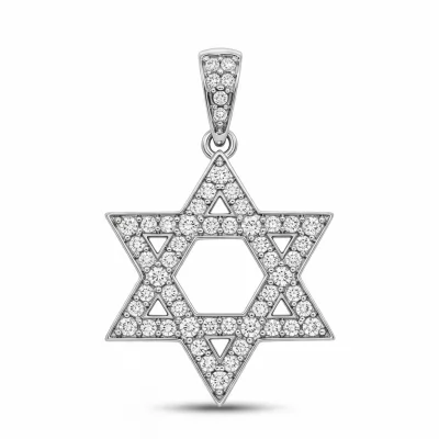 This exquisite Jewish Necklace features a meticulously crafted Star of David pendant, symbolizing heritage and unity. Set in luminous 18KT white gold, the intricate geometric form is entirely paved with brilliant cut diamonds. The precise micro-setting technique allows light to maximize the stones' fire, creating a dazzling display. It hangs gracefully from a delicate yet strong chain, making it an essential piece for meaningful daily wear or significant occasions.