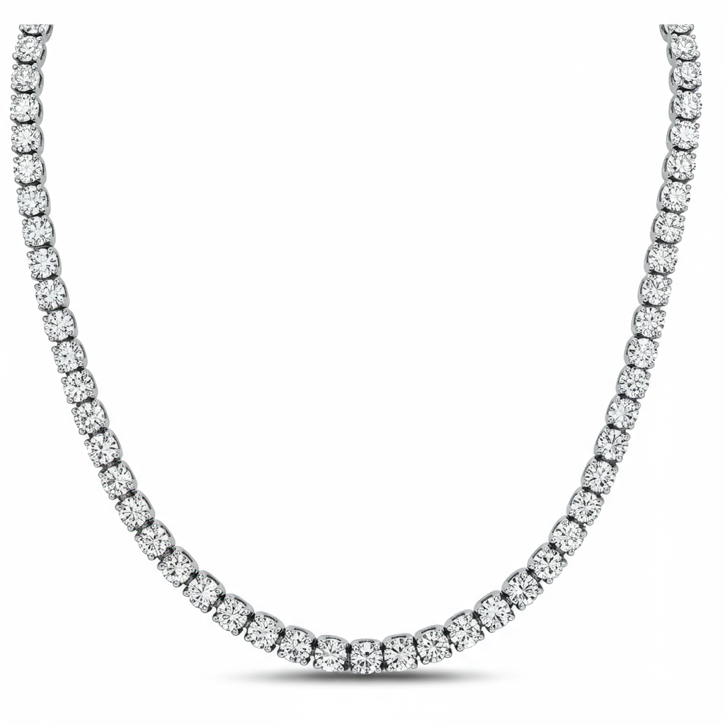This exquisite Lab Grown Tennis Necklace embodies timeless sophistication and radiant modern luxury. Expertly crafted in 18KT white gold, this continuous line of brilliant round VVS diamonds ensures magnificent, uninterrupted sparkle. Each stone is meticulously secured in a four-prong basket setting, creating a flexible, comfortable drape around the neck. A true statement piece, this necklace transitions effortlessly from elegant daytime wear to glamorous evening events, offering breathtaking fire and brilliance.