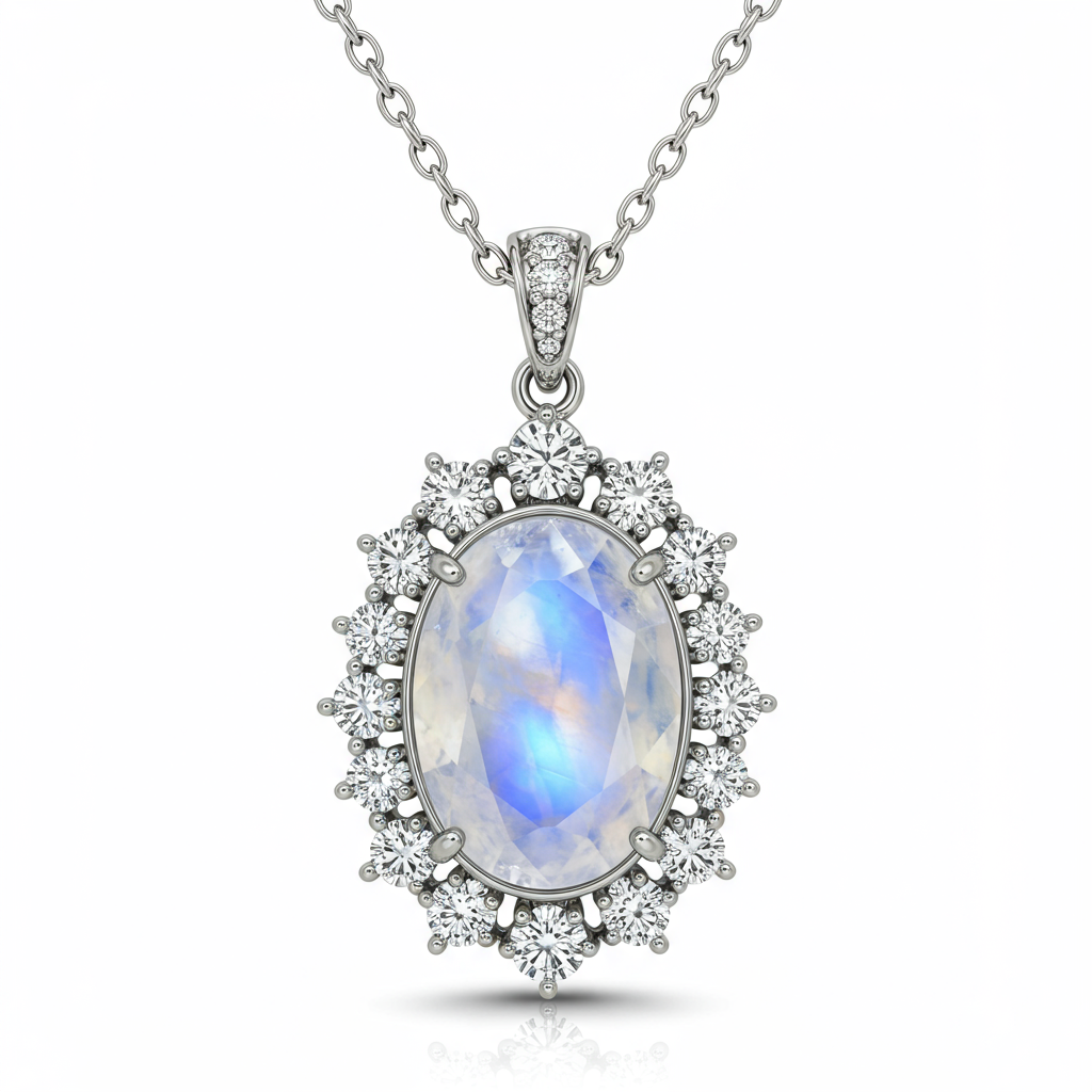 The Moon Gemstone Necklace captures celestial grace, centered around a luminous, custom-cut gemstone reminiscent of moonlight. Surrounded by a delicate halo of brilliant diamonds, this piece exemplifies modern elegance and refined luxury. Crafted in exquisite 18KT white gold, the design is both sophisticated and timelessly romantic. It rests perfectly at the décolletage, offering a breathtaking sparkle that transitions seamlessly from day to evening wear.