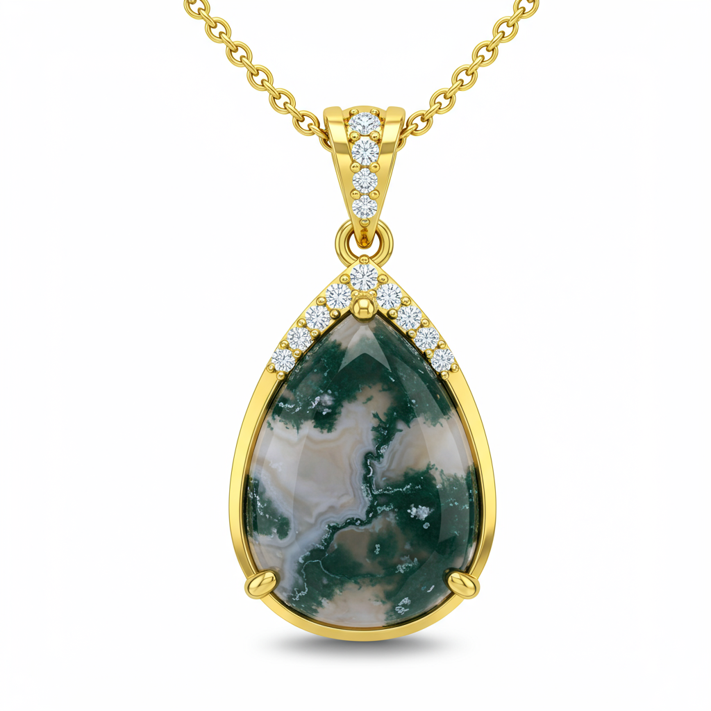The Moss Agate Necklace captures the essence of a tranquil, hidden forest, featuring a stunning natural moss agate centerpiece with distinct, organic inclusions. This large, teardrop-shaped gem is meticulously set within a delicate 18KT yellow gold frame, emphasizing the unique landscape within the stone. Fine VVS round diamonds accent the ornate bail, providing a subtle, sophisticated sparkle and contrast. This exceptional piece is a perfect fusion of organic beauty and refined luxury, designed for the wearer who cherishes connection to nature.